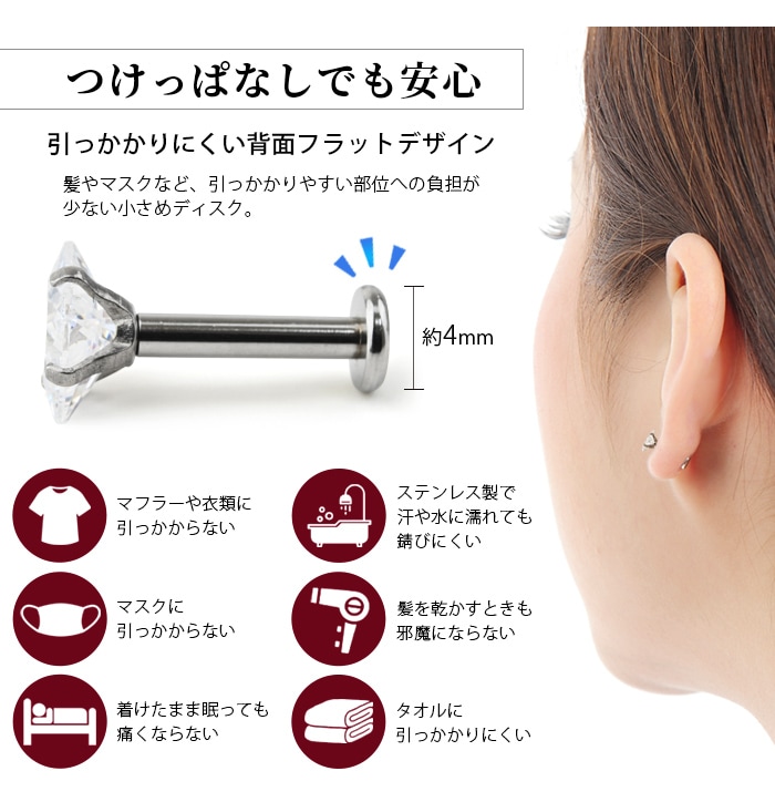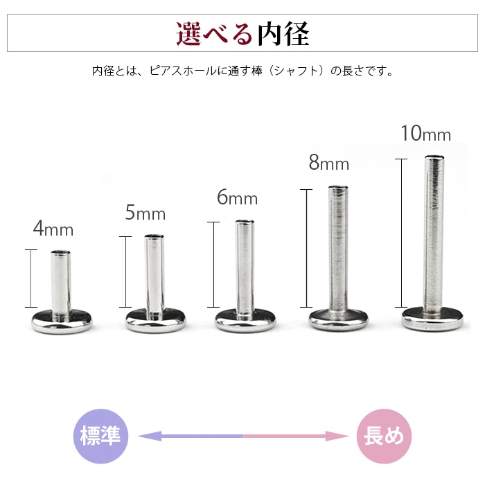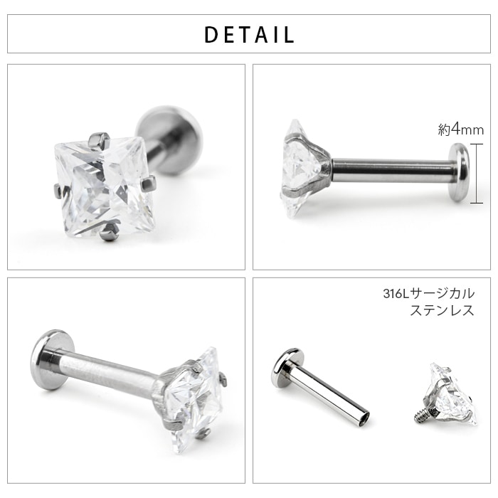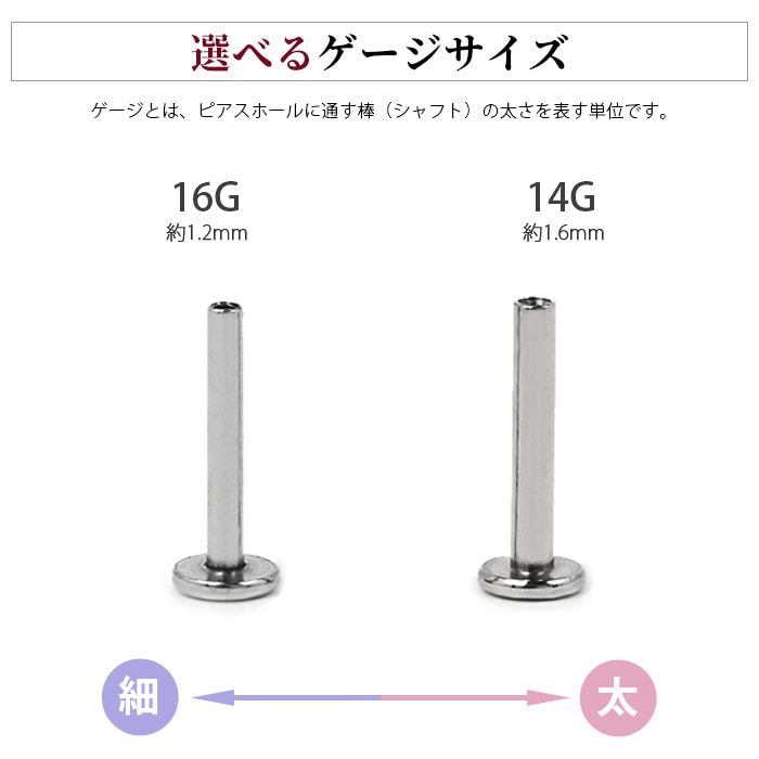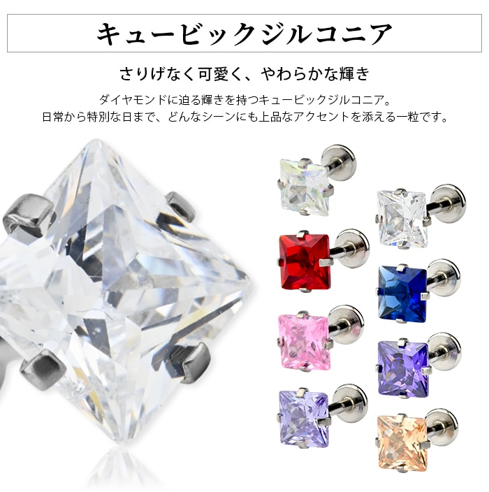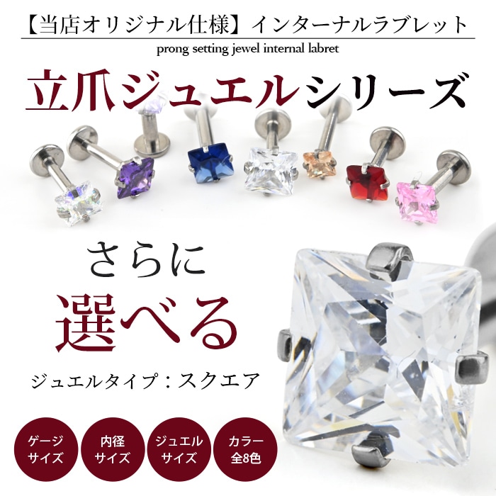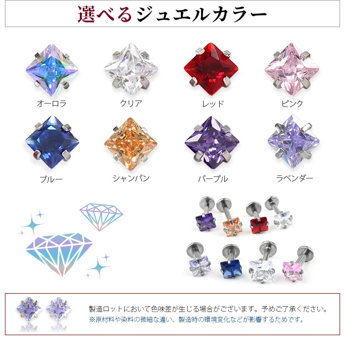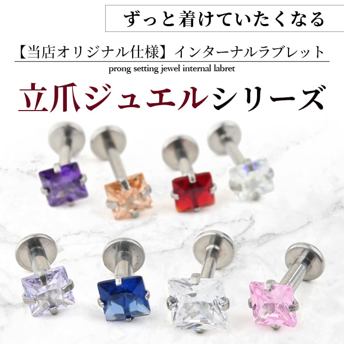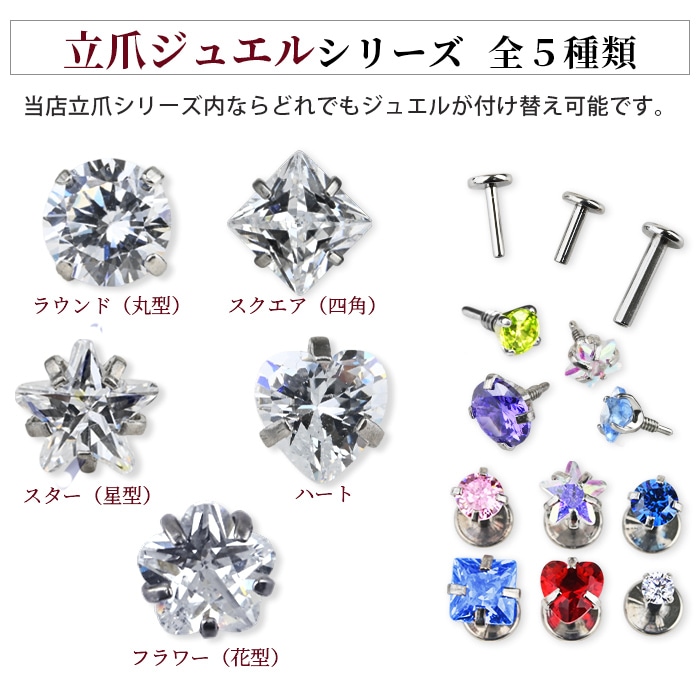 不動の人気を誇る、キラキラジュエル立爪のボディピアス。ジュエルは4つの爪でしっかり止まっているので、どの部位でも安心です。ホールにとても優しいインターナル(内ネジ)タイプ。ネジ山が直接ホールに触れないため、ホールを傷つけずファーストピアスやセカンドピアスなど長く愛用できます。カラーはオーロラ、クリア、レッド、ピンク、ブルー、パープルなど人気のカラーをご用意しました。太さは一般的な16G、14Gと人気のサイズをご用意致しました。ジュエルのサイズも3mm、4mm、5mmの3サイズからお好きなサイズがお選び頂けます。太さ、ジュエルカラー、ジュエルサイズ、内径と自分にピッタリなピアスをカスタムできます。耳たぶ、軟骨ピアス、トラガス、もちろん口ピアスに、カスタムで自分だけのボディピアスをお選び頂けます。