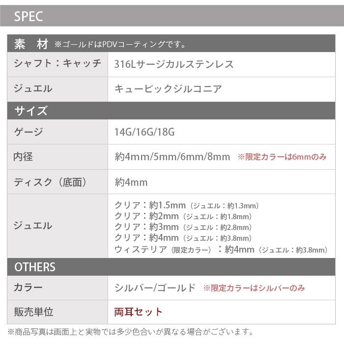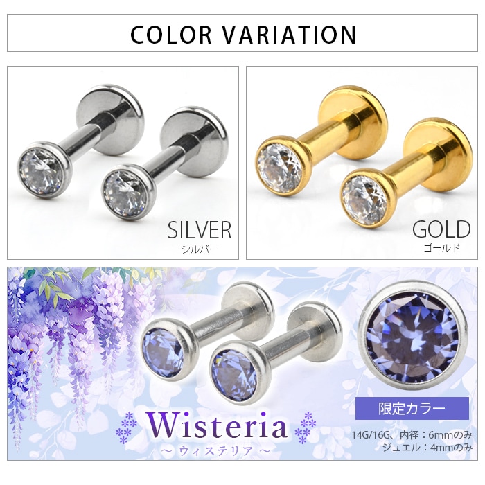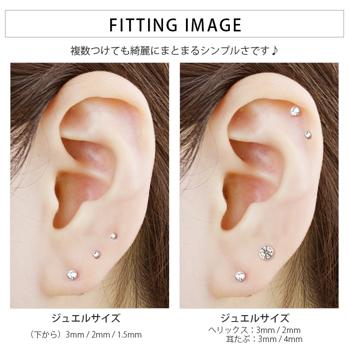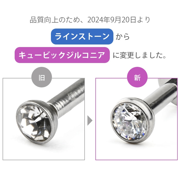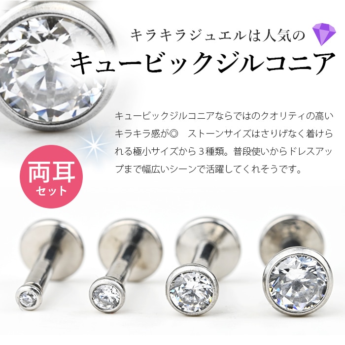 フクリン留めのキュービックジルコニアがキラキラ可愛い、シンプルな定番ピアスです。背面フラットのラブレットスタッドなので、マスクや髪にもひっかかりにくいのが◎ ジュエルはさりげなく上品な極小1.5mmサイズからしっかり存在感のある4mmサイズまでで、4種類のジュエルを全部着けても、上品にまとまってうるさくならないサイズ感です♪ ゲージ・内径も選べる豊富なサイズ展開です!