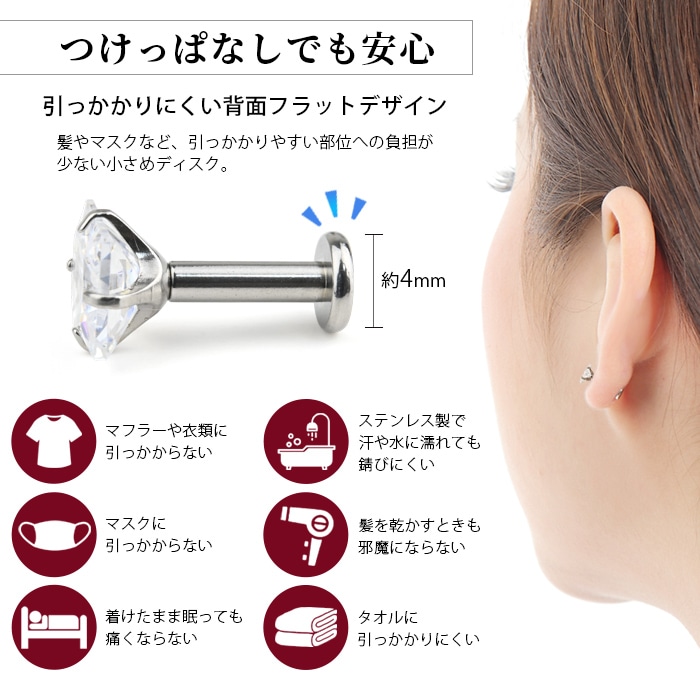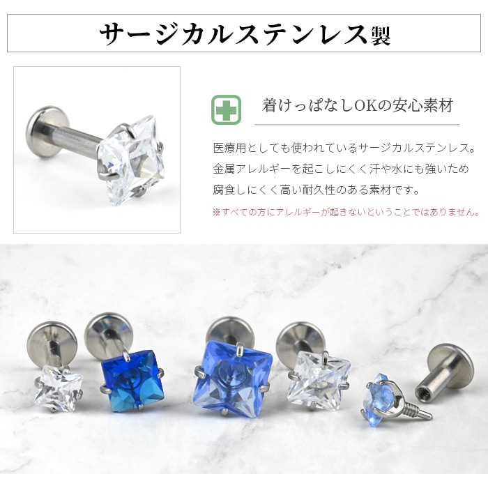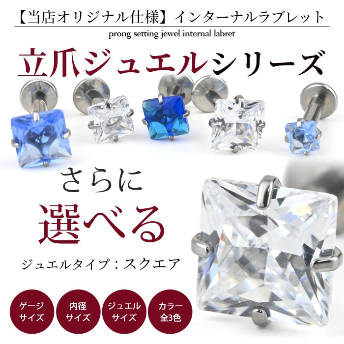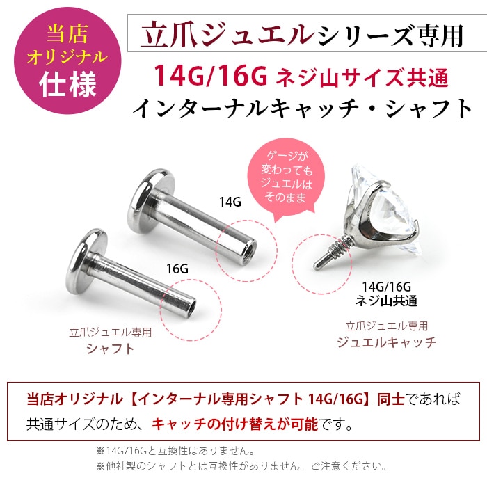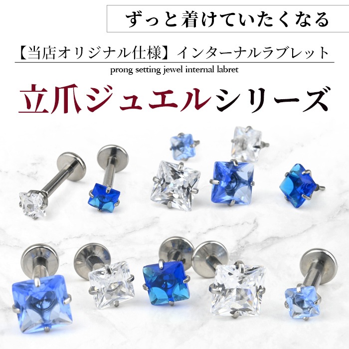 不動の人気を誇る、キラキラジュエル立爪のボディピアス。ジュエルは4つの爪でしっかり止まっているので、どの部位でも安心です。ホールにとても優しいインターナル(内ネジ)タイプ。ネジ山が直接ホールに触れないため、ホールを傷つけずファーストピアスやセカンドピアスなど長く愛用できます。カラーはオーロラ、クリア、レッド、ピンク、ブルー、パープルなど人気のカラーをご用意しました。太さは一般的な16G、14Gと人気のサイズをご用意致しました。ジュエルのサイズも3mm、4mm、5mmの3サイズからお好きなサイズがお選び頂けます。太さ、ジュエルカラー、ジュエルサイズ、内径と自分にピッタリなピアスをカスタムできます。耳たぶ、軟骨ピアス、トラガス、もちろん口ピアスに、カスタムで自分だけのボディピアスをお選び頂けます。