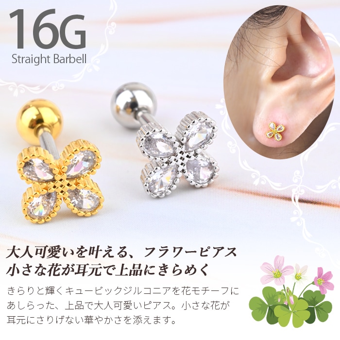 軟骨 ピアス ボディピアス 16g 16ゲージ サージカルステンレス イヤーカフ イヤーカフ風 花 フラワー ストレートバーベル 金属アレルギー対応 軟骨用 耳たぶ 軟骨ピアス 耳用 イヤー ロブ イヤカフ風 トラガス ヘリックス シルバー ゴールド ストレートバーベル e03-58