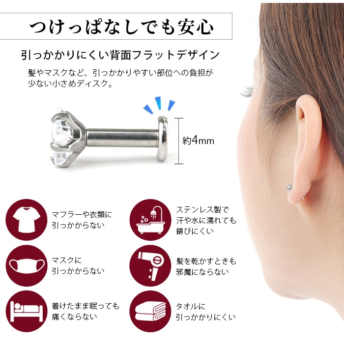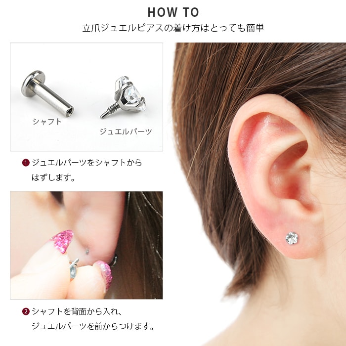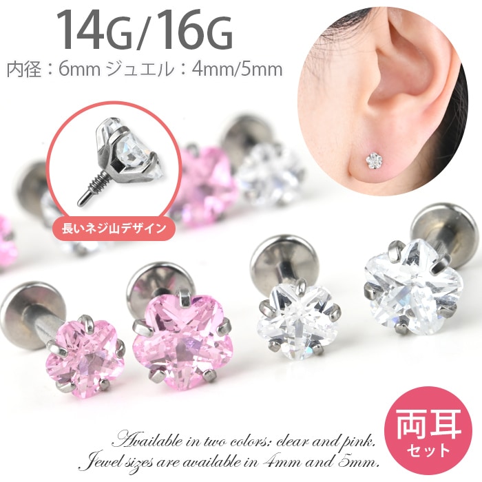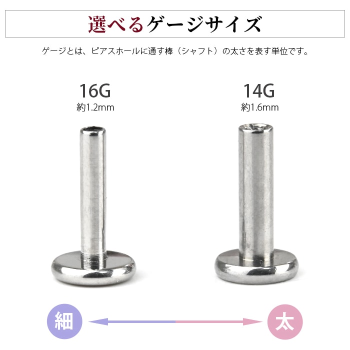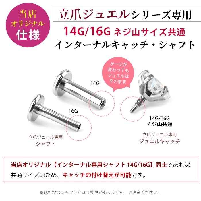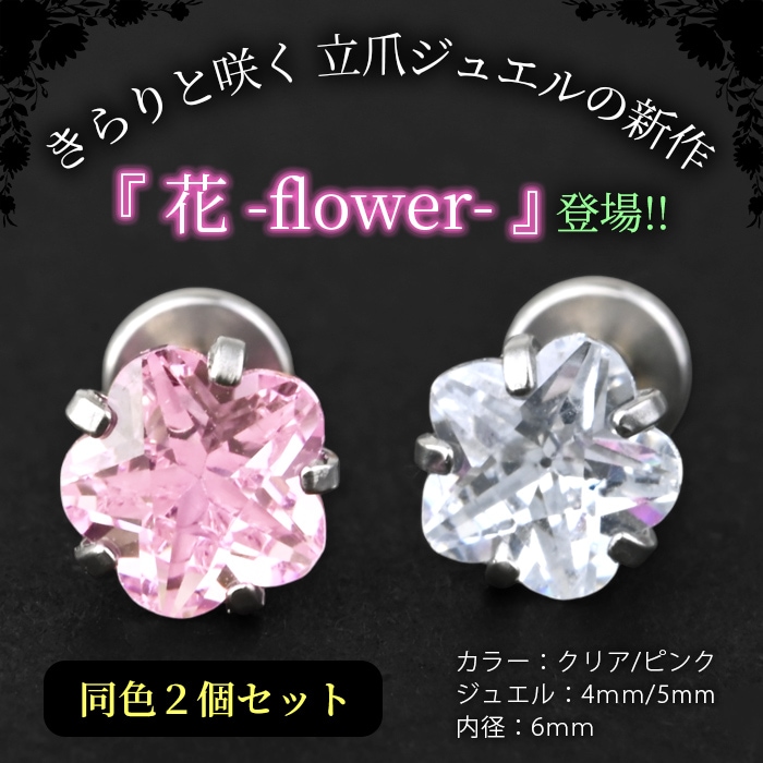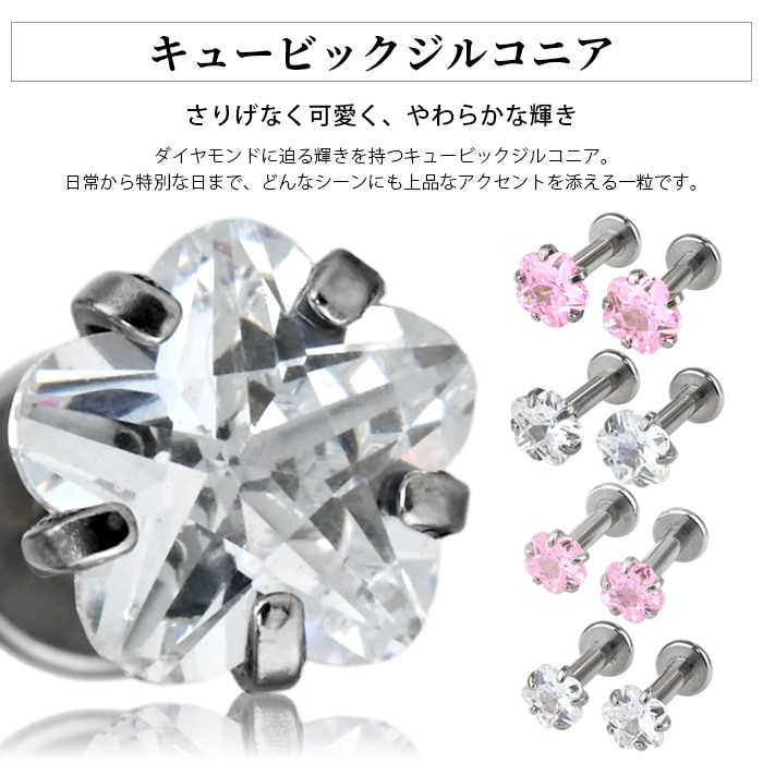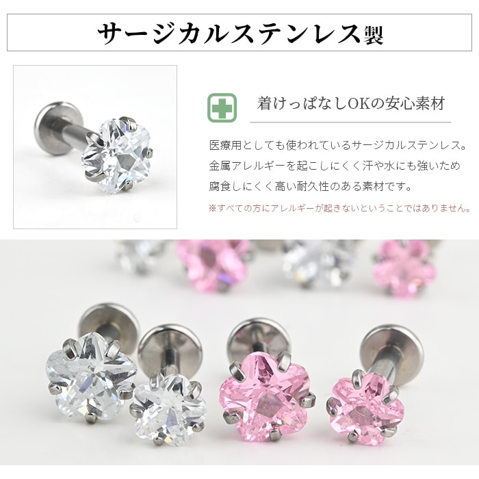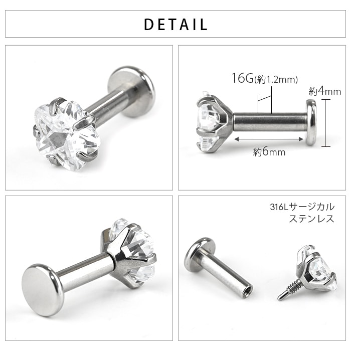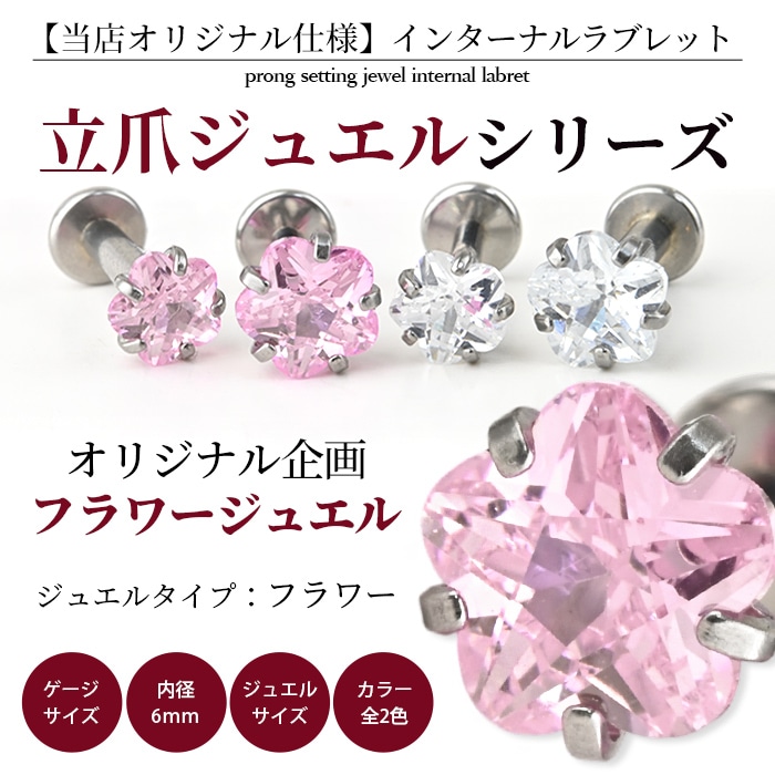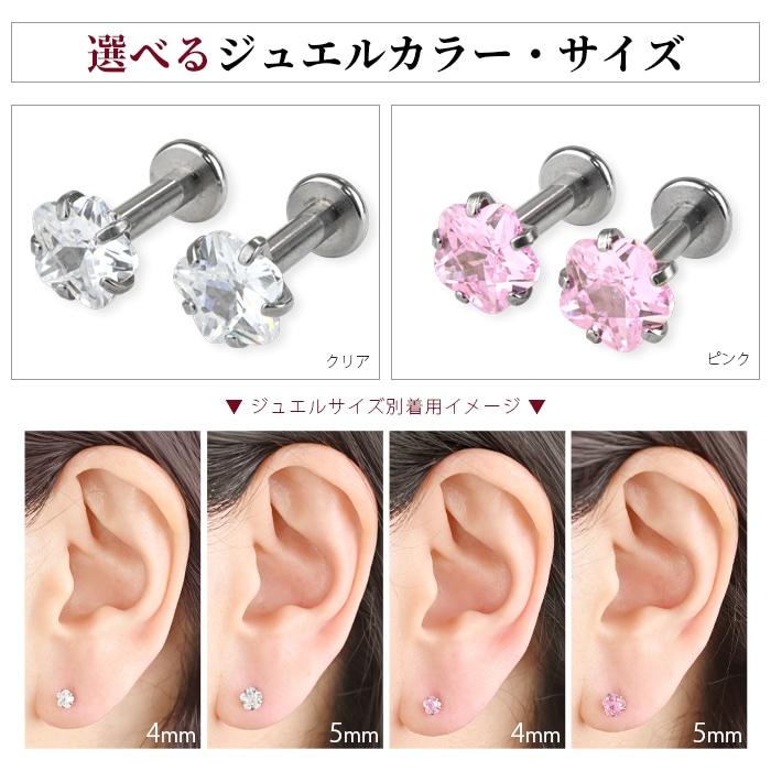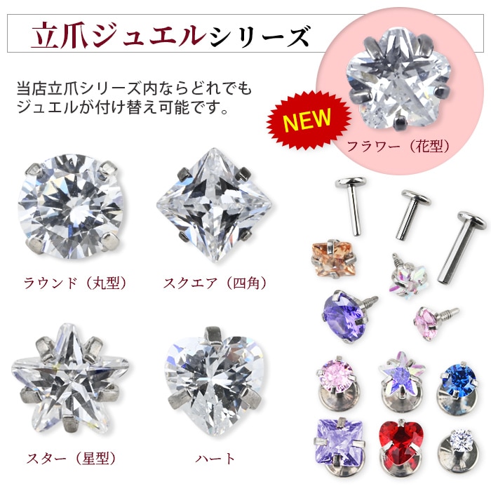 きらりと咲く立爪ジュエルの新作『花』登場! 当店オリジナル仕様インターナル(ネジ山)サイズ。ゲージ・内怪(シャフト)・ジュエルサイズにかかわらず、インターナル(ネジ山)14G/16Gは共通サイズでお作りしています。この立爪ジュエルシリーズだけのオリジナル仕様!! シンプルだからほかのピアスと複数着けコーデもしやすくて◎。シャフトは引っ掛かりにくく人気のラブレットスタッドです。耳たぶはもちろん、トラガスやヘリックスなど軟骨ピアスとしても大活躍してくれそうです♪ シャフト素材は316Lサージカルステンレスを使用。